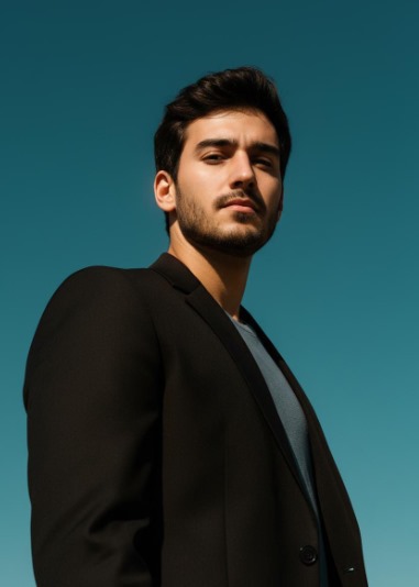 A cinematic low-angle portrait of a person wearing a black blazer, standing confidently under a clear teal sky. The camera looks upward, emphasizing their commanding presence. Natural sunlight highlights their form, casting soft shadows.