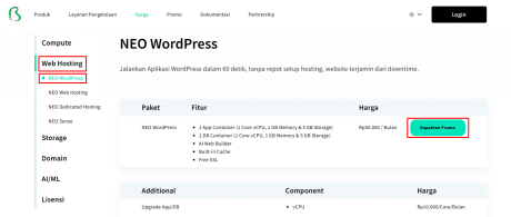 12. Terdapat beberapa paket hosting yang dapat Anda beli, pada tutorial ini kami memilih paket Neo WordPress pada menu Web Hosting. Silakan tekan tombol Dapatkan Promo pada paket yang dipilih.