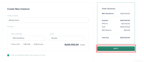 13. Anda akan diarahkan ke halaman pendaftaran jika anda belum Log In terlebih dahulu. Berikan nama website di Instance Name tanpa spasi. Pilih NEO WordPress pada Select Package. Pada Cycle, silahkan pilih rentang pembayaran, apakah mau bulanan(Monthly) atau tahunan (Annually). Jika sudah, klik Next.