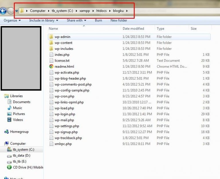- Buka folder XAMPP di komputer Anda. Kemudian buka folder htdocs. Copy-kan file WordPress ke dalam folder ini. Lebih mudahnya, silahkan buka Windows Explorer, lalu ketikkan C:\xampp\htdocs pada bagian folder address
