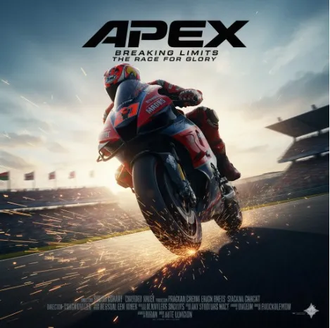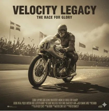 Bayangkan poster film Hollywood, tetapi bertema MotoGP dengan motor balap, pembalap terkenal, atau momen ikonik lintasan.
